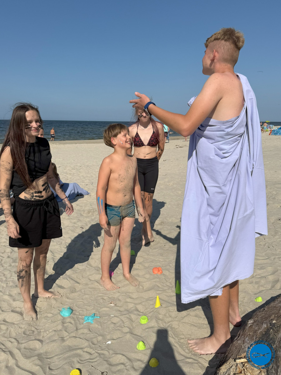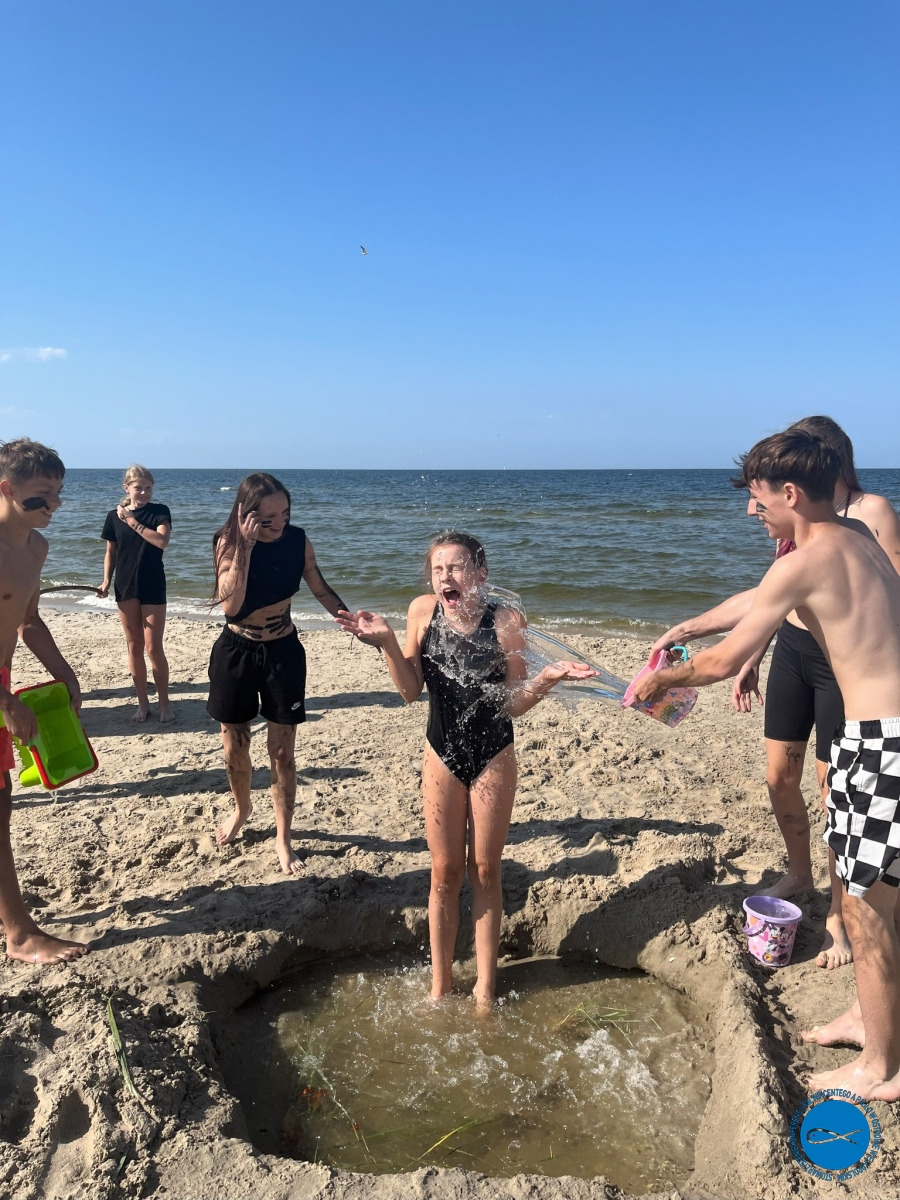 Plażowanie, kąpiele w morzu i budowanie z piasku to oczywiście nieodłączny element naszych wakacji. Codziennie rano, pełni energii, wyruszaliśmy na „rozruch poranny” – gimnastykę na świeżym powietrzu, która dodawała nam sił na cały dzień. Zdobyliśmy też nowe doświadczenia podczas wyprawy łodzią motorową, podziwiając foki w ich naturalnym środowisku. Nawet jazda meleksem w deszczu okazała się świetną zabawą!